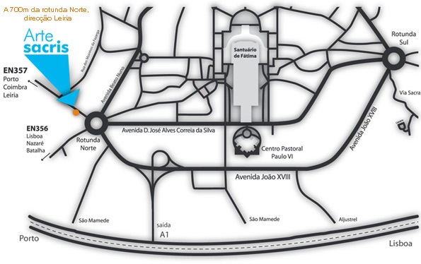 MoradaAv.Nª.Srª de Fátima, 108, Apartado 702496-908 FátimaPortugalTelf: + 351 249 532 350+ 351 249 532 751Chamada para a rede fixa nacionalFax: +351 249 532 326geral@artesacris.comGPS: 39º 38` 25,2" N 8º 41` 5,5" W